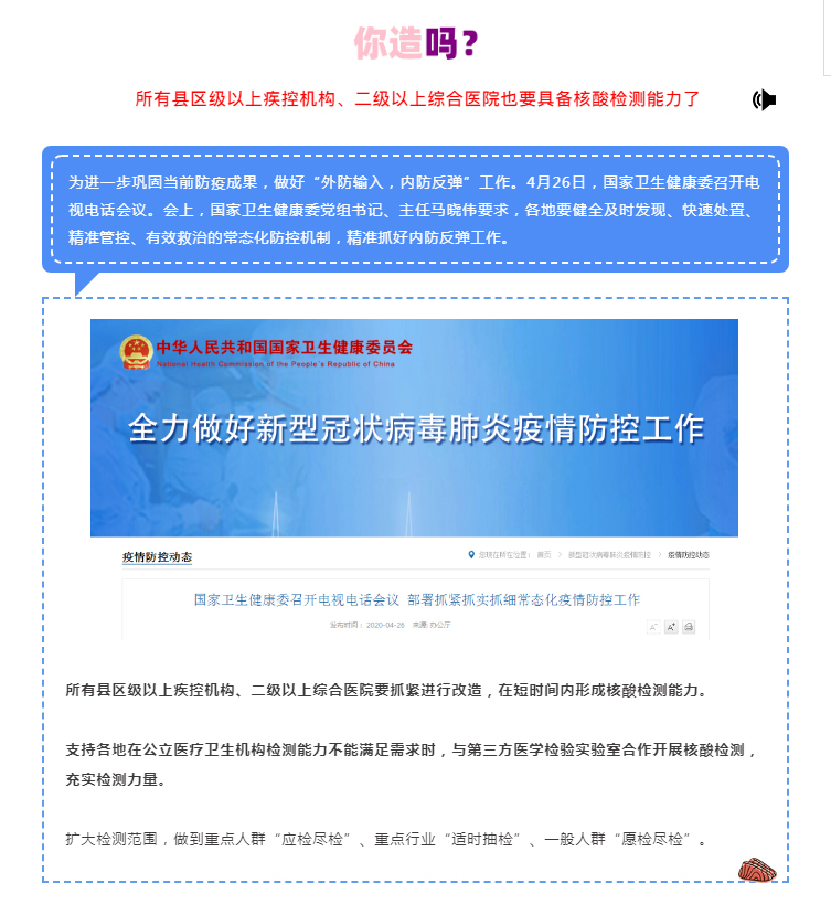 國家衛生健康委黨組書(shū)記、主任馬曉偉要求,各地要健全及時(shí)發(fā)現、快速處置、精準管控、有效救治的常態(tài)化防控機制,精準抓好內防反彈工作。所有縣區級以上疾控機構、二級以上綜合醫院要抓緊進(jìn)行改造,在短時(shí)間內形成核酸檢測能力。支持各地在公立醫療衛生機構檢測能力不能滿(mǎn)足需求時(shí),與第三方醫學(xué)檢驗實(shí)驗室合作開(kāi)展核酸檢測,充實(shí)檢測力量。