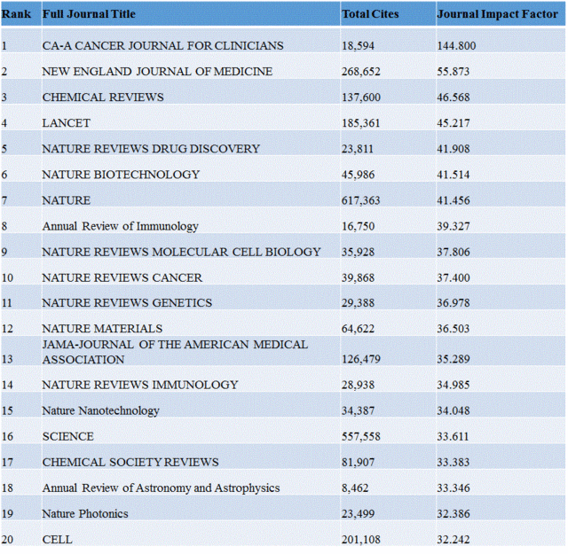 2016年6月14日訊-- 北京時(shí)間6月14日,湯森路透《SCI期刊分析報告》(Journal Citation Reports)新鮮出爐。第一第二依然是CA-Cancer J Clin和NEJM,NATURE REVIEWS DRUG DISCOVERY此次排名上升為第三。第4-7位分別為L(cháng)ancet,NATURE BIOTECHNOLOGY,NATURE REVIEWS IMMUNOLOGY,NATURE MATERIALS。