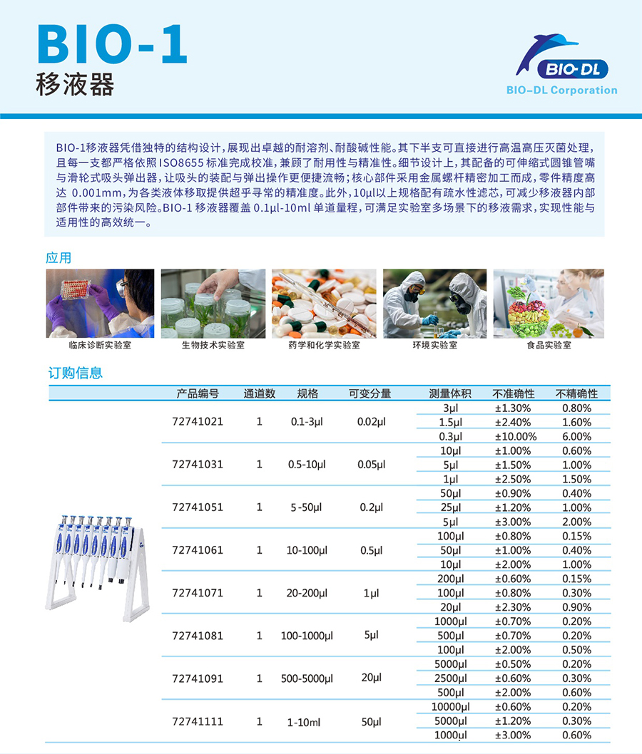 移液器Bio-1特選精良的材質(zhì),具有出色的耐化學(xué)腐蝕性和抗紫外線(xiàn)性能,可伸縮式圓錐管嘴和滑輪式吸頭彈出器使吸頭更容易裝配和彈出,四位數字顯示窗,為移取各種類(lèi)型液體提供更精確的結果。涵蓋0.1μ1-10ml單道量程及0.5u1-300ul多道量程。